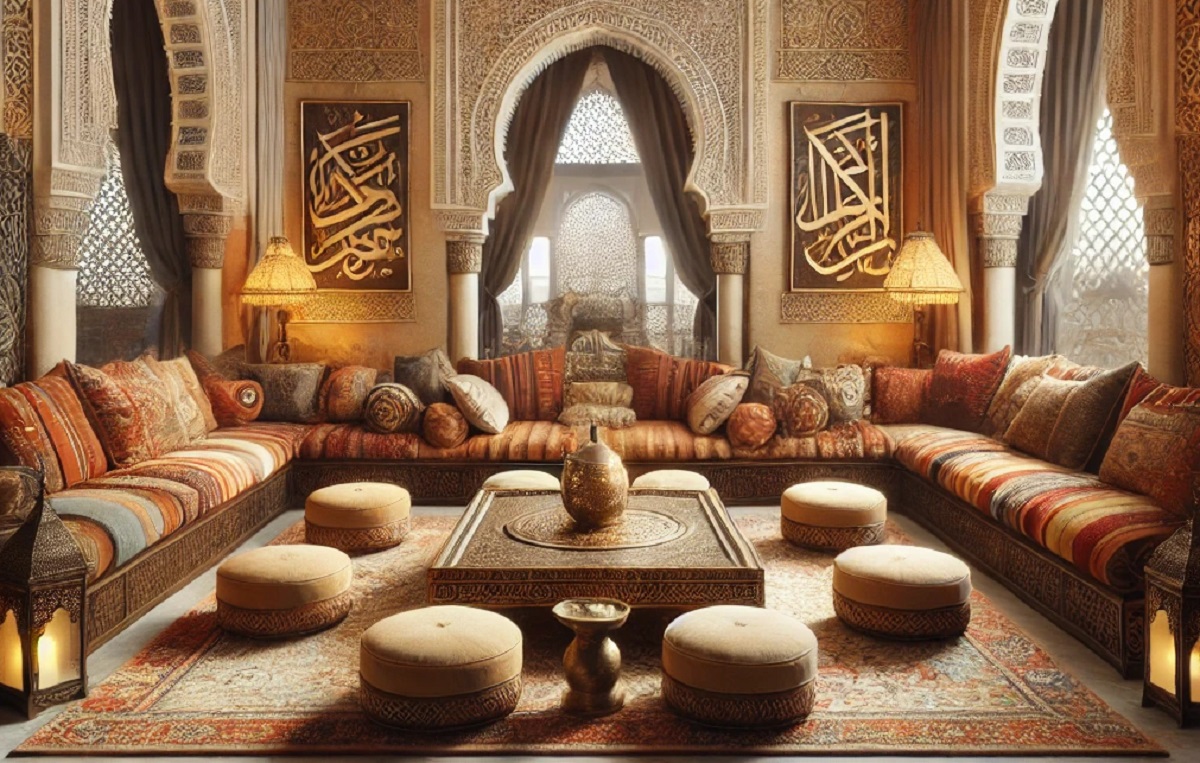 Jika Anda ingin menciptakan suasana yang lebih mewah dan hangat, dekorasi dengan nuansa Timur Tengah bisa menjadi pilihan yang sempurna. Karpet dengan corak khas Timur Tengah, bantal warna emas dan merah marun, serta ornamen kaligrafi yang dipajang di dinding akan memberikan nuansa kemewahan yang khas.