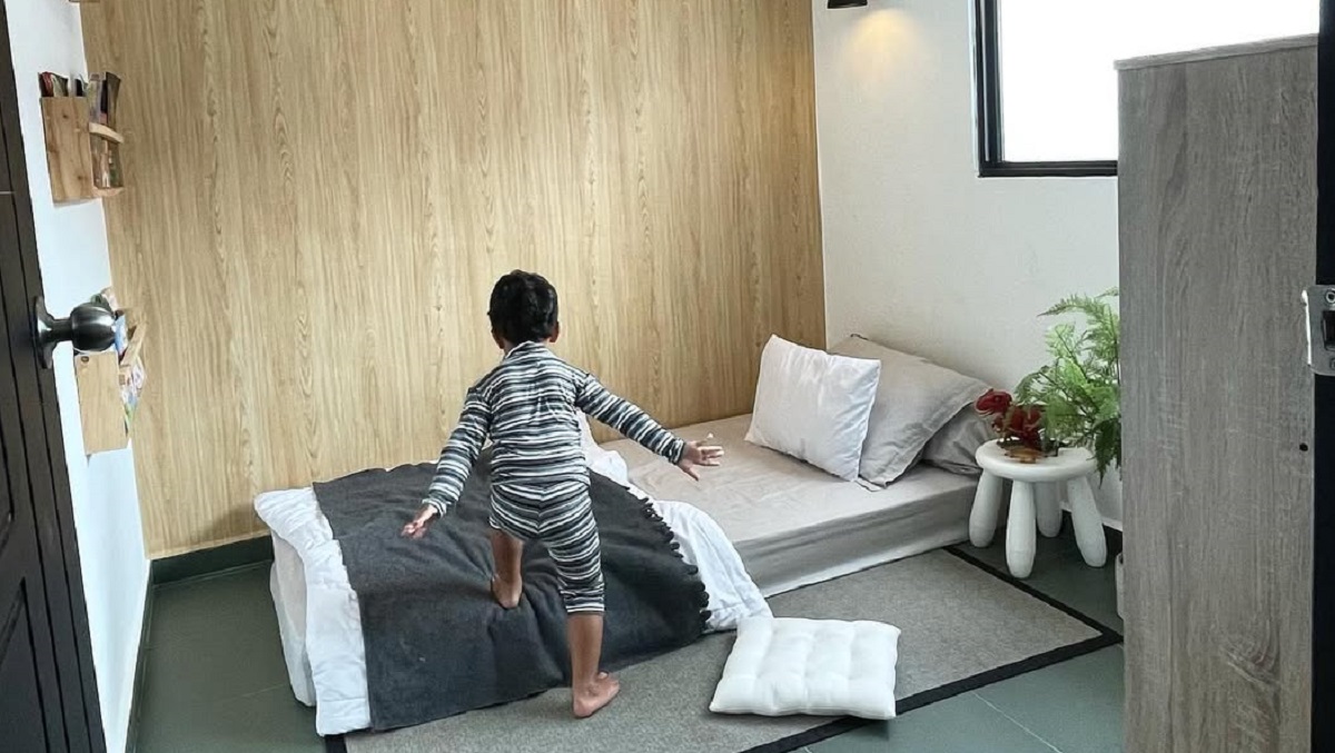 Desain kamar tidur anak yang satu ini terinspirasi dari unggahan Instagram @mirahutri, yang mengusung konsep “less is more.” Fokus utamanya adalah menciptakan ruang yang lega dan fungsional, memungkinkan anak bergerak bebas tanpa banyak hambatan dari dekorasi berlebihan yang mudah berdebu atau mempersempit ruang.