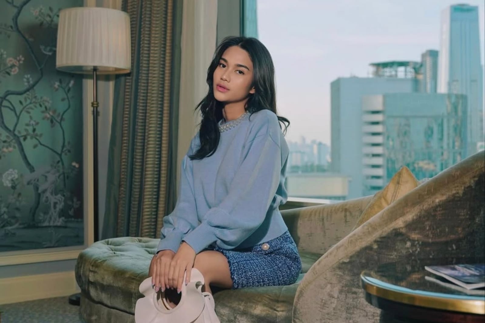 Azizah tiba di lokasi sekitar pukul 14.54 WIB dengan tampilan kasual nan elegan, memakai blouse biru muda, celana putih, topi senada, dan sepatu putih.