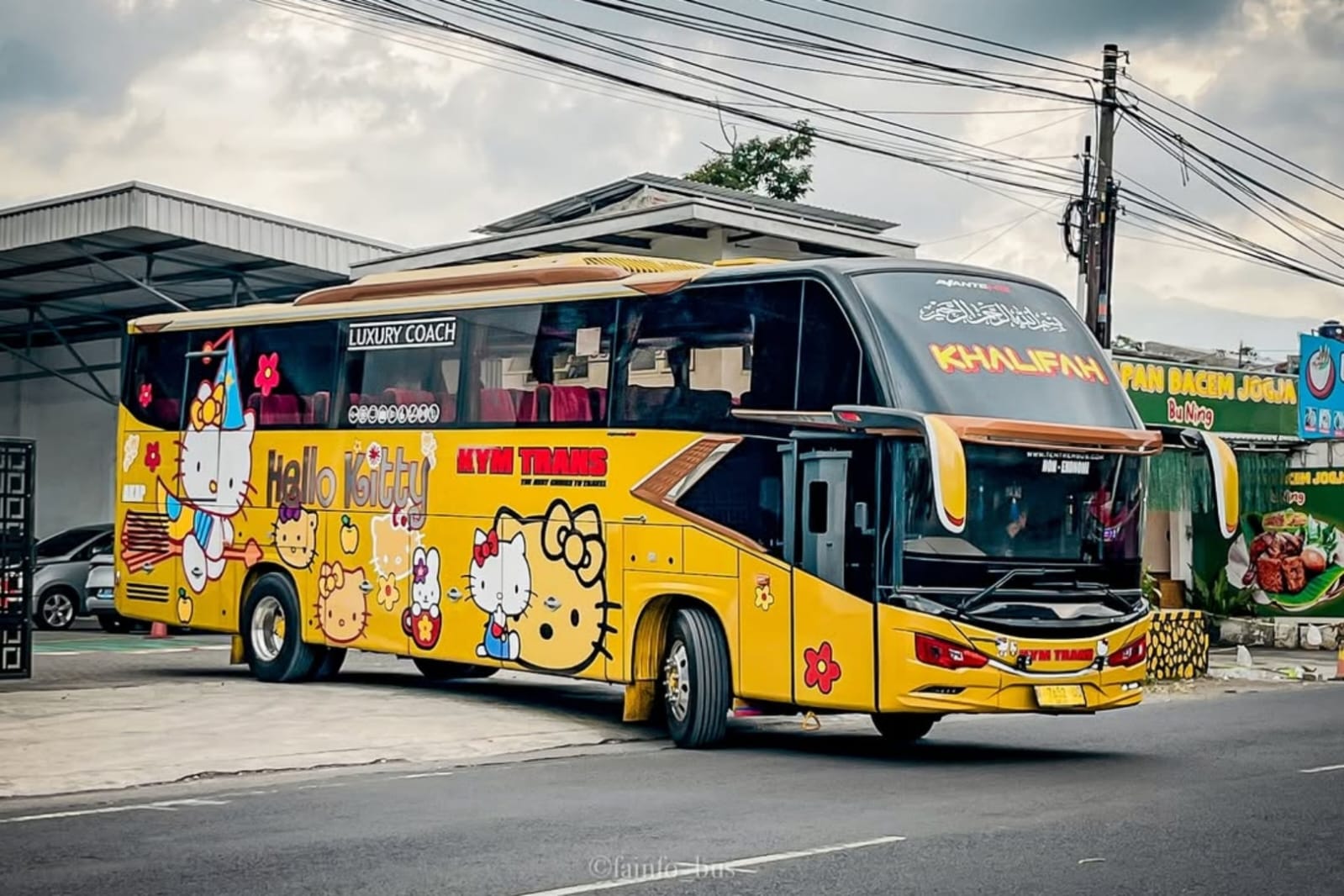 Buat kamu yang belum pernah naik, bus PO KYM ini hadir dengan tampilan yang cukup ikonik dengan nuansa Hello Kitty di bodi busnya.