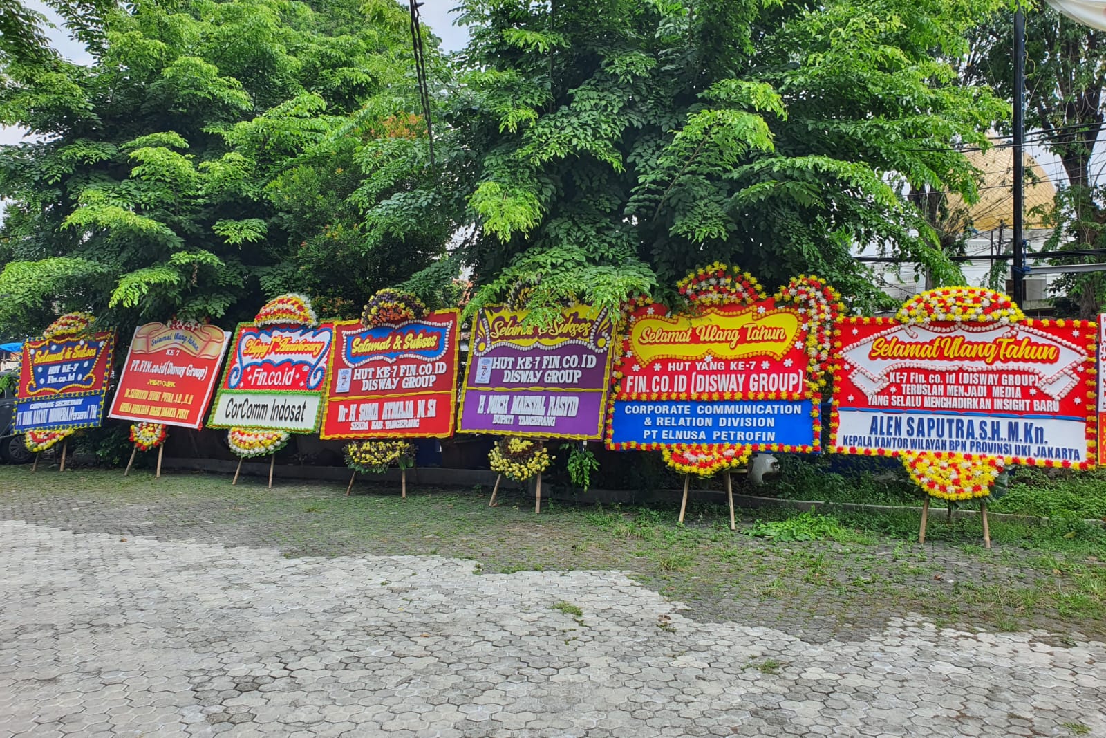 Deretan karangan bunga ucapan selamat berdiri rapi, jadi simbol dukungan dan apresiasi atas perjalanan fin.co.id selama 7 tahun terakhir di dunia media digital Indonesia.