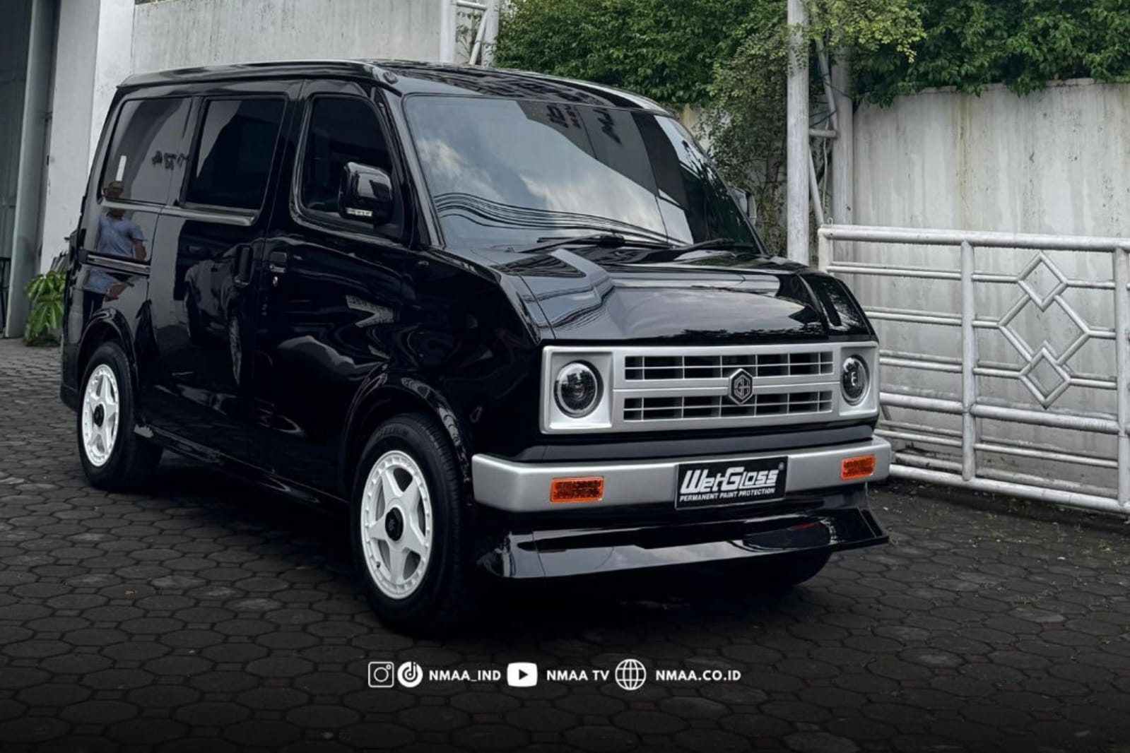 Gran Max yang biasanya tampil sederhana kini berubah total, rna bodi hitam mengkilap dipadukan dengan velg putih menambah kesan sporty elegan.