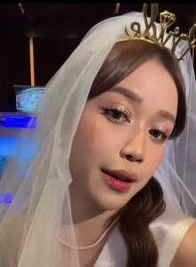 Penampilannya semakin lengkap dengan veil atau kerudung pengantin dan mahkota bertuliskan “Bride to Be” serta aksesori kalung dan anting mutiara yang memberi sentuhan glamor