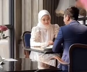Inara mengenakan gaun dan hijab putih, sementara sang pria terlihat menyodorkan kotak perhiasan berwarna merah yang membuat Inara tersenyum.
