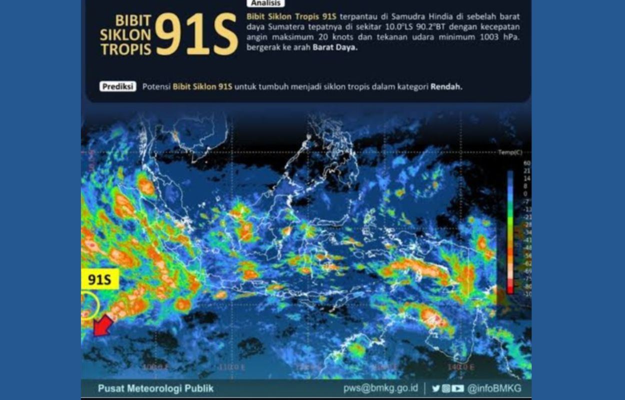Pihak BMKG memantau keberadaan bibit siklon 91S yang bergerak ke arah timur dari Samudera Hindia di barat Lampung. Meski sistem ini diperkirakan akan melemah dalam 48 hingga 72 jam ke depan dengan kecepatan angin maksimum 10-15 knot, dampaknya terhadap curah hujan tetap perlu diantisipasi.
