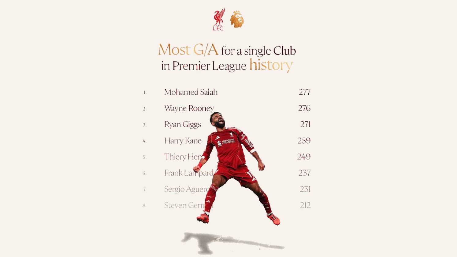 Lewat kontribusi itu, total gol dan assist Mo Salah bersama Liverpool mencapai 277, sekaligus melewati rekor Wayne Rooney yang sebelumnya mengoleksi 276 kontribusi gol selama membela Manchester United.