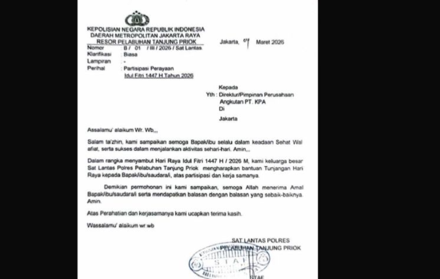 Sebelumnya, beredar sebuah surat dengan kop Polres Pelabuhan Tanjung Priok bernomor B/01/III/2026/Sat Lantas yang memuat perihal “Partisipasi Perayaan Idul Fitri 1447 Hijriah/2026”. Surat tersebut ditujukan kepada Direktur atau pimpinan perusahaan angkutan PT KPA dan bertanggal 4 Maret 2026.