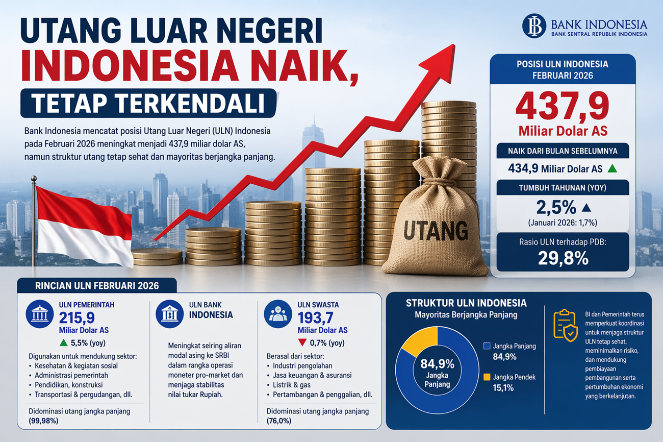 finnews.id – Bank Indonesia mencatat utang luar negeri (ULN) Indonesia pada Februari 2026 mencapai 437,9 miliar dolar AS. Meski mengalami kenaikan, kondisi ULN dinilai tetap terjaga dengan rasio terhadap produk domestik bruto (PDB) sebesar 29,8 persen.